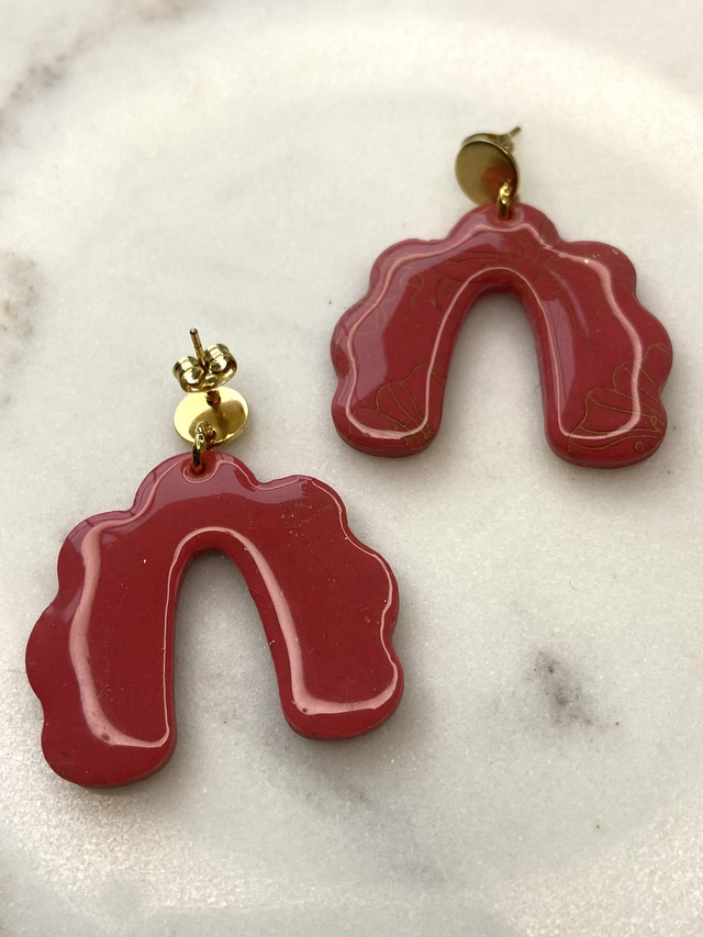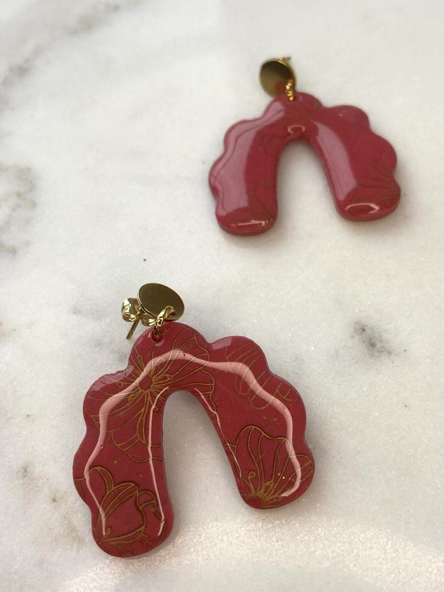 Les boucles sont fabriquées en pâte polymère avec une finition brillante en résine. Imprimé fin motif floral couleur or. Apprêt en acier inoxydable de couleur doré. Chaque pièce est faite à la main et avec le cœur ce qui explique qu'elle peut comporter des petits défauts.