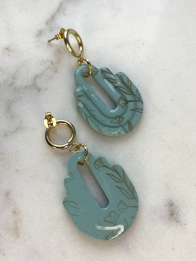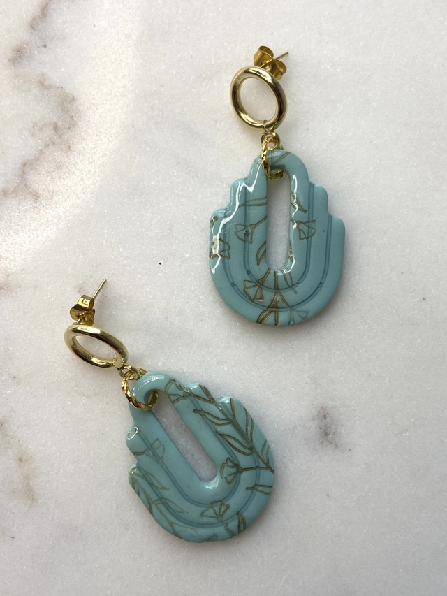 Les boucles sont fabriquées en pâte polymère avec une finition brillante en résine. Apprêt en acier inoxydable de couleur doré. Impression florale dorée. Chaque pièce est faite à la main et avec le cœur ce qui explique qu'elle peut comporter des petits défauts.