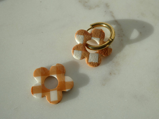 Les boucles sont fabriquées en pâte polymère avec une finition brillante en résine. Fleur avec motif vichy marron finition "grain" et dos de la boucle brillante grâce à une finition résine. Apprêt en acier inoxydable de couleur doré. Chaque pièce est faite à la main et avec le cœur ce qui explique qu'elle peut comporter des petits défauts.